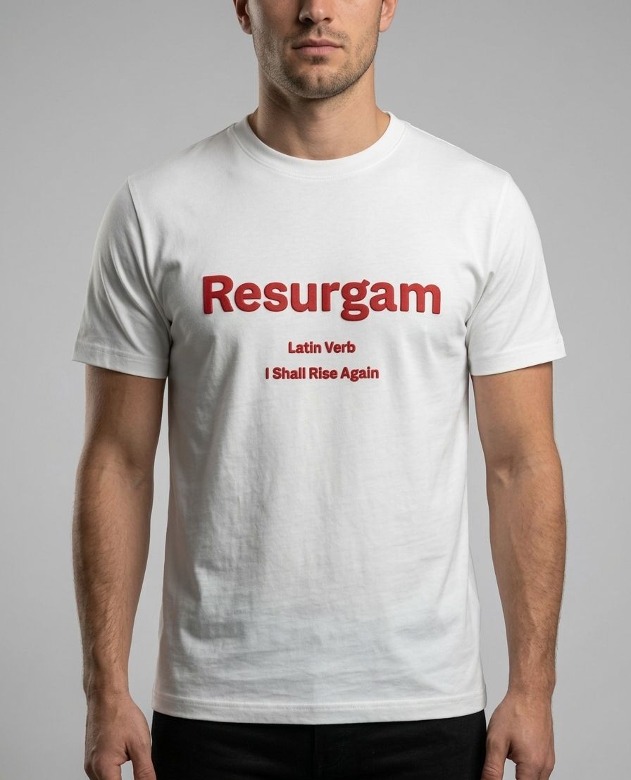 * Front: Features a bold, minimalist puff-print of “Resurgam”—the Latin verb for “I Shall Rise Again.” The raised texture adds a tactile, premium dimension to the clean typography.